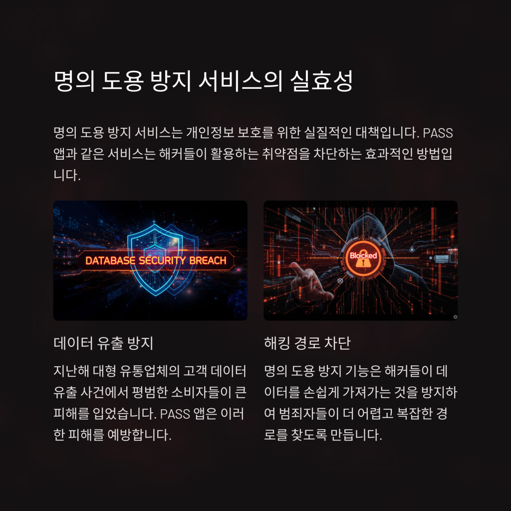 가령, 지난해 한 대형 유통업체의 고객 데이터가 유출된 사건에서 평범한 소비자들이 큰 피해를 입었던 사례가 있습니다. 이런 상황에서 PASS 앱과 같은 명의 도용 방지 서비스는 개인의 정보를 지키기 위한 필수적인 도구로 자리잡고 있습니다.
