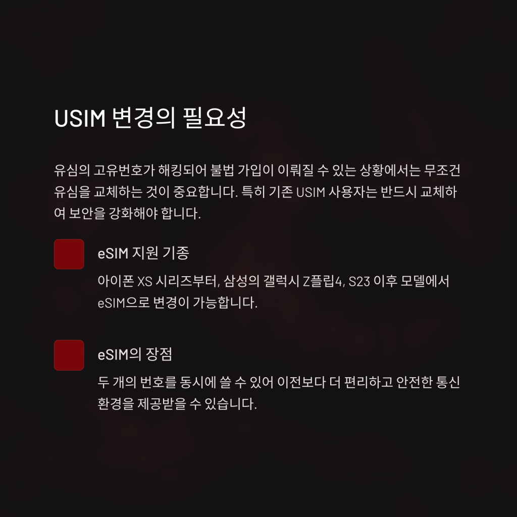 예를 들어, eSIM은 두 개의 번호를 동시에 쓸 수 있어 이전보다 더 편리하고 안전한 통신환경을 제공받을 수 있습니다. 반대로, 이를 잘 활용하지 않는다면 여전히 유심의 고유번호가 해킹당할 가능성이 남아 있습니다.