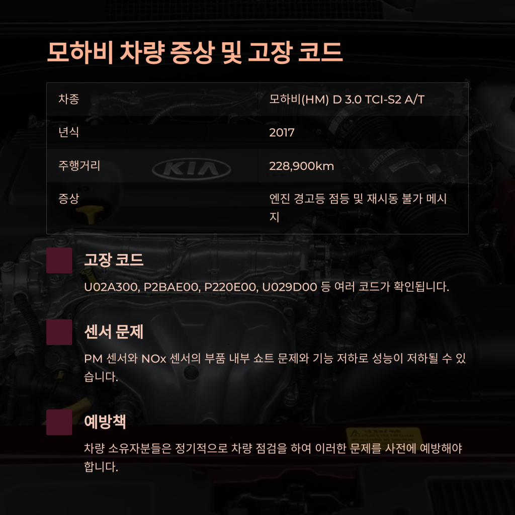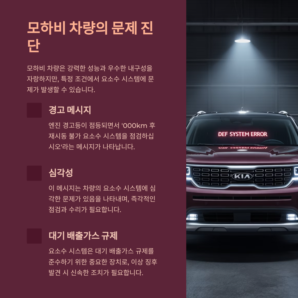 모하비요소수 시스템은 차량의 성능과 안정성을 결정짓는 중요한 요소입니다. 최근, 2017년식 모하비 차량에서 엔진 경고등과 ‘요소수 시스템을 점검하십시오’ 메시지가 점등되는 사례가 발생했습니다.