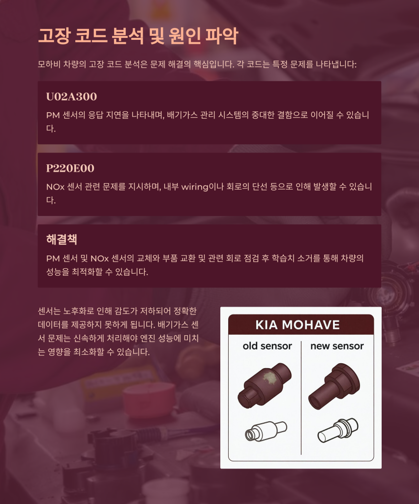 예를 들어, **U02A300** 오류는 PM 센서의 응답 지연을 나타내며, 이는 차량의 배기가스를 관리하는 시스템에서 중대한 결함으로 이어질 수 있습니다. 이 외에도 **P220E00**과 같은 다른 고장 코드들은 NOx 센서 관련 문제를 지시합니다.