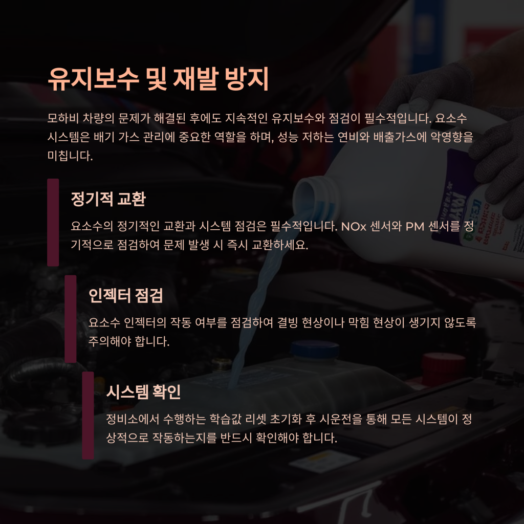 문제가 발생한 경우, 간단한 수리로 복구할 수 있지만, 지속적인 관리가 이루어지지 않을 경우 같은 문제가 다시 발생할 수 있습니다. 예를 들어, 정기적으로 NOx 센서와 PM 센서를 점검하여 문제가 발생했을 때 즉시 교환하는 것이 필요합니다.