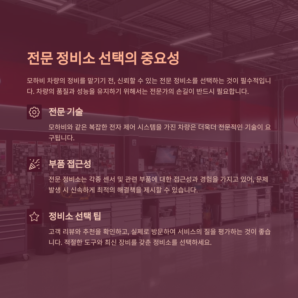 정비소는 차량 문제에 대한 정확한 진단과 능숙한 수리를 제공해야 하며, 다양한 브랜드와 모델에 대한 경험이 있어야 합니다. 특히, 모하비와 같은 복잡한 전자 제어 시스템을 가진 차량은 더욱더 전문적인 기술이 요구됩니다.