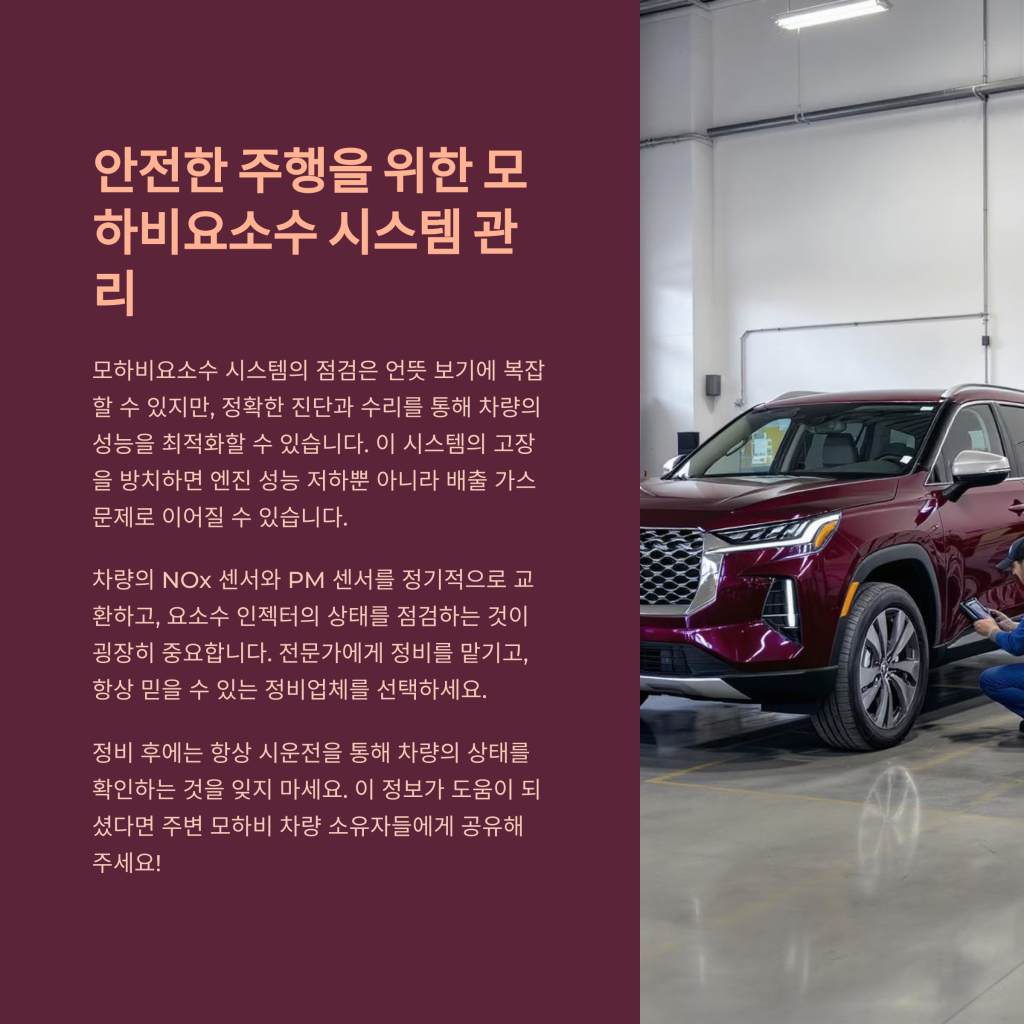 정비 후에는 항상 시운전을 통해 차량의 상태를 확인하는 것을 잊지 마세요. 안전하고 즐거운 드라이브를 위해 모하비요소수 시스템을 잘 관리해 나가시길 바랍니다!