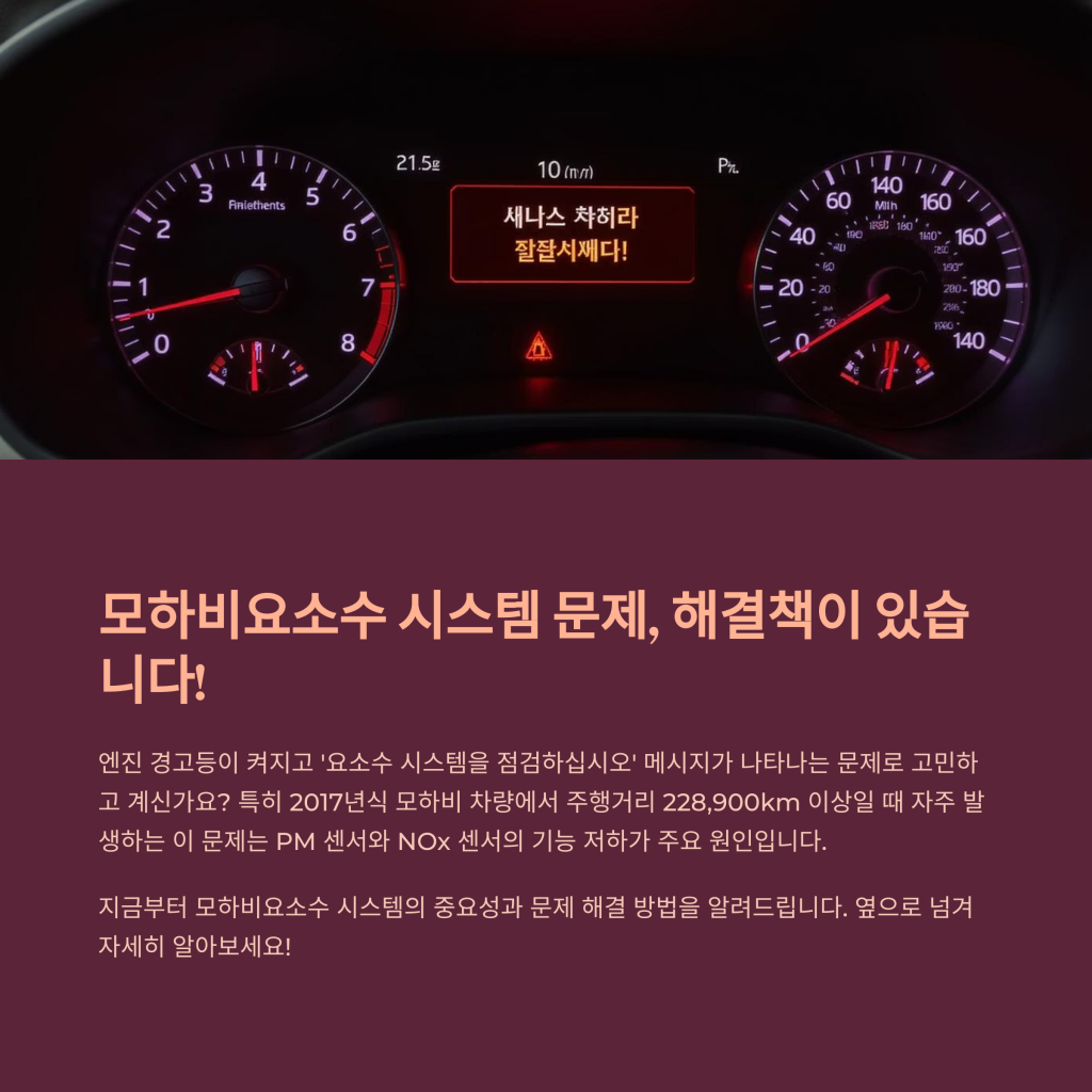 모하비요소수 시스템은 차량의 성능과 안정성을 결정짓는 중요한 요소입니다. 최근, 2017년식 모하비 차량에서 엔진 경고등과 ‘요소수 시스템을 점검하십시오’ 메시지가 점등되는 사례가 발생했습니다.