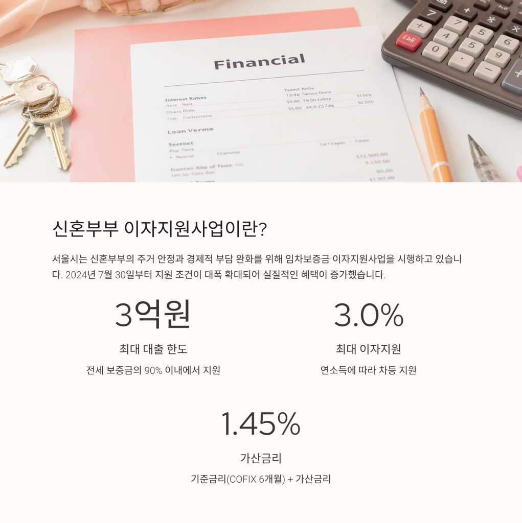 서울시는 신혼부부의 주거 안정과 주거비 부담을 완화하기 위해 신혼부부 임차보증금 이자지원사업을 시행하고 있습니다. 이 제도는 신혼부부가 전세 계약을 통해 임대주택을 이용할 때 필요한 보증금에 대해 대출 이자의 일부를 지원하는 방식으로 운영됩니다.