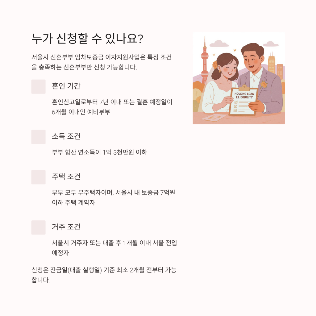 둘째, 부부 합산 연소득이 1억 3천만원 이하이어야 하며, 셋째, 신청자 본인과 배우자는 모두 무주택자여야 합니다. 넷째, 서울시 거주자이거나 대출 후 1개월 이내에 서울로 전입할 예정인 자여야 합니다.