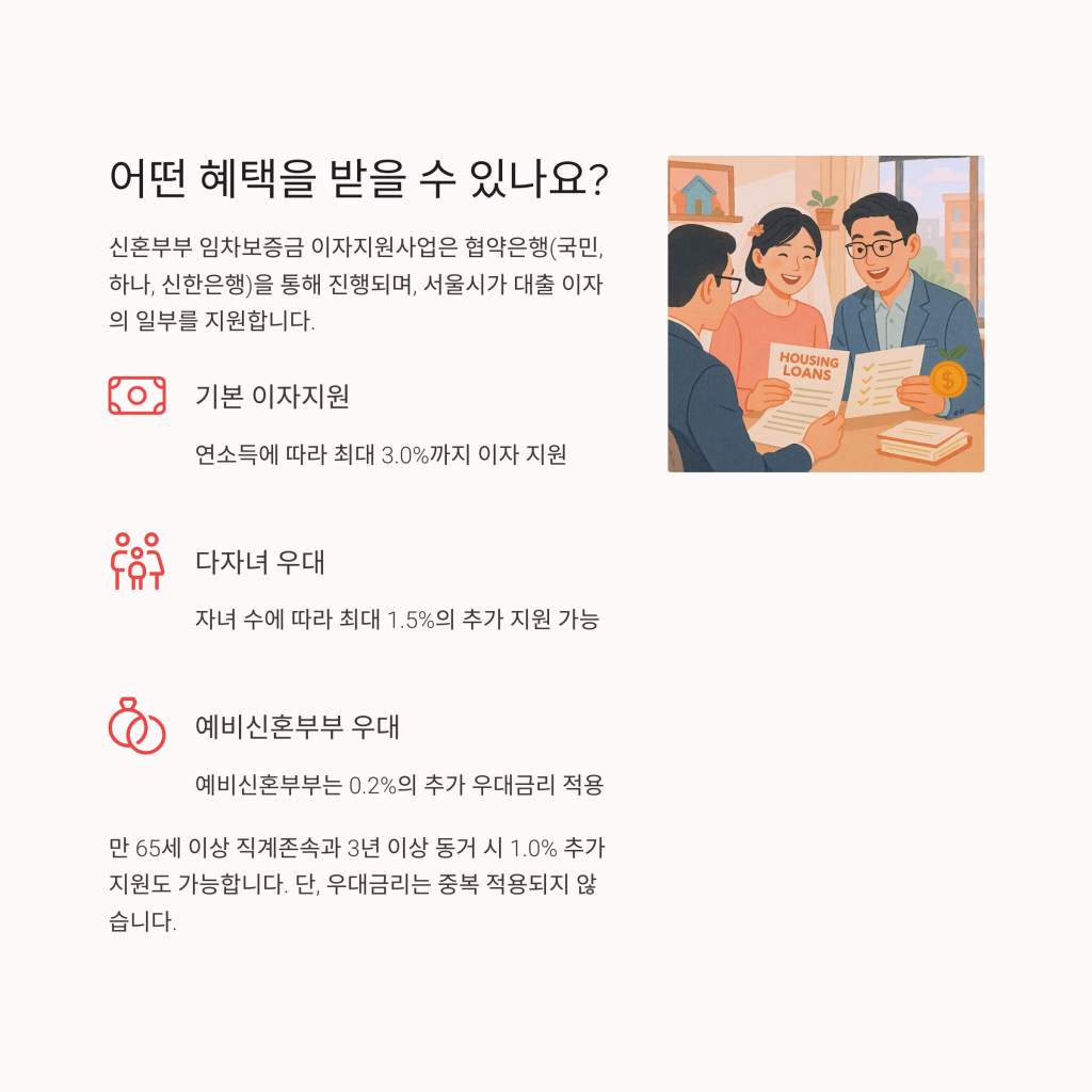 이자 지원은 연소득에 따라 최대 3.0%까지 가능하며, 다자녀 가구 또는 예비신혼부부에게는 추가 혜택도 제공됩니다. 특히, 2024년 7월 30일부터는 전세보증금 반환보증 가입 시 보증료까지 지원받을 수 있어 더욱 의미가 큽니다.