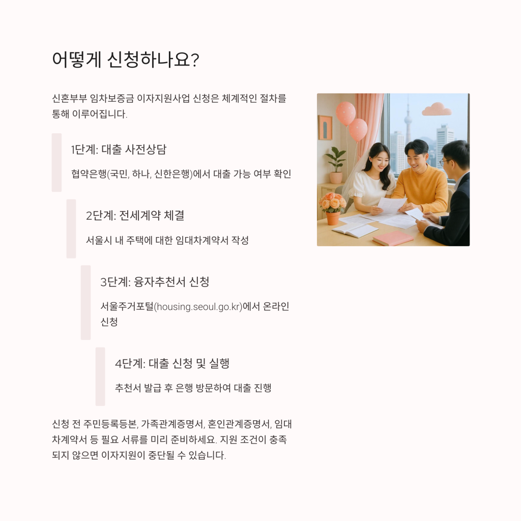 신혼부부 임차보증금 이자지원사업 신청은 다음과 같은 절차를 통해 이루어집니다. 첫 번째로, 협약은행에서 대출 사전 상담을 통해 대출 가능 여부를 확인해야 합니다.