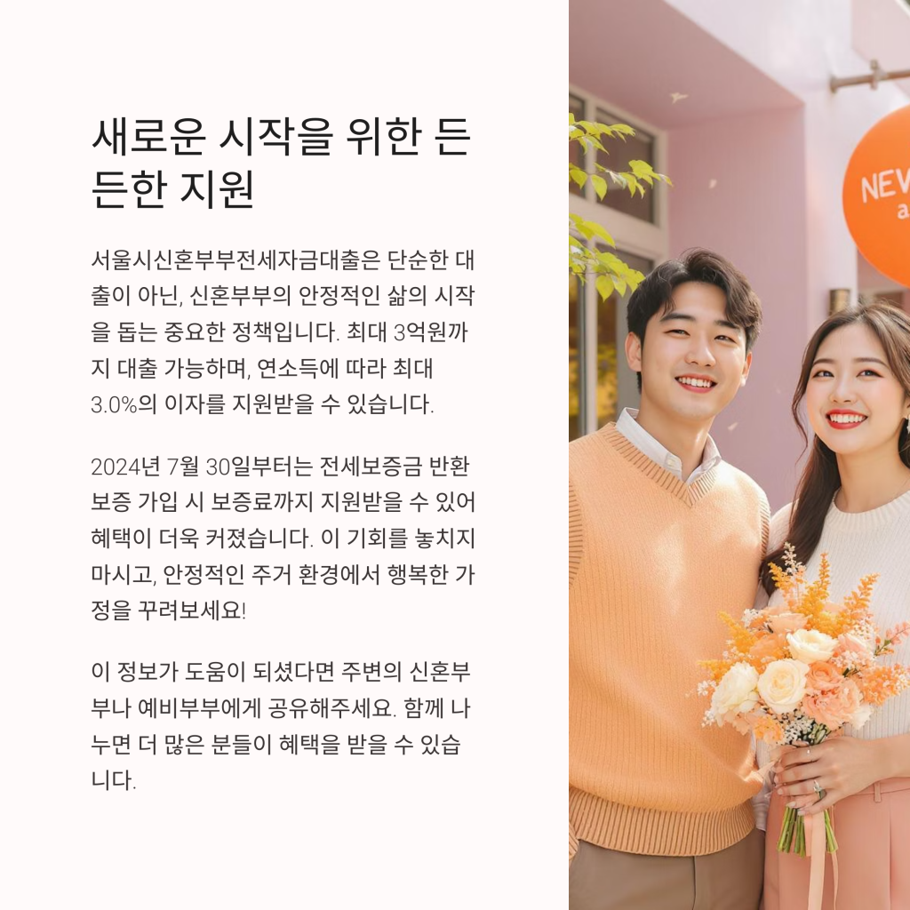 서울시신혼부부전세자금대출은 단순한 대출이 아니라 신혼부부가 안정적인 삶을 시작할 수 있도록 도와주는 중요한 정책입니다. 이 지원 제도를 통해 최대 3억원까지 전세 자금을 대출받을 수 있으며, 그에 따른 이자를 서울시가 일부 지원해주기 때문에 부담이 크게 줄어듭니다.