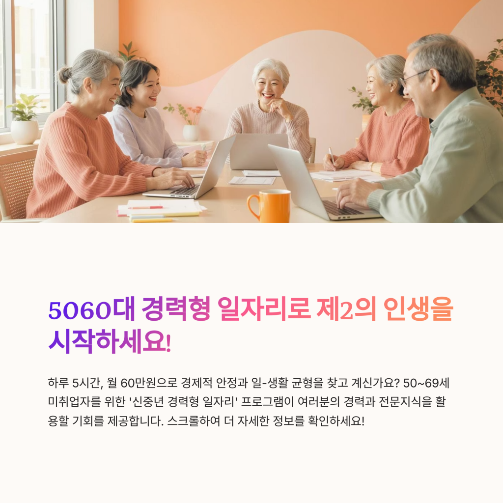 5060일자리는 일정한 수입을 확보하면서도 시간적 유연성을 제공하여 작은 행복과 안정을 찾고자 하는 이들에게 적합한 선택지입니다.