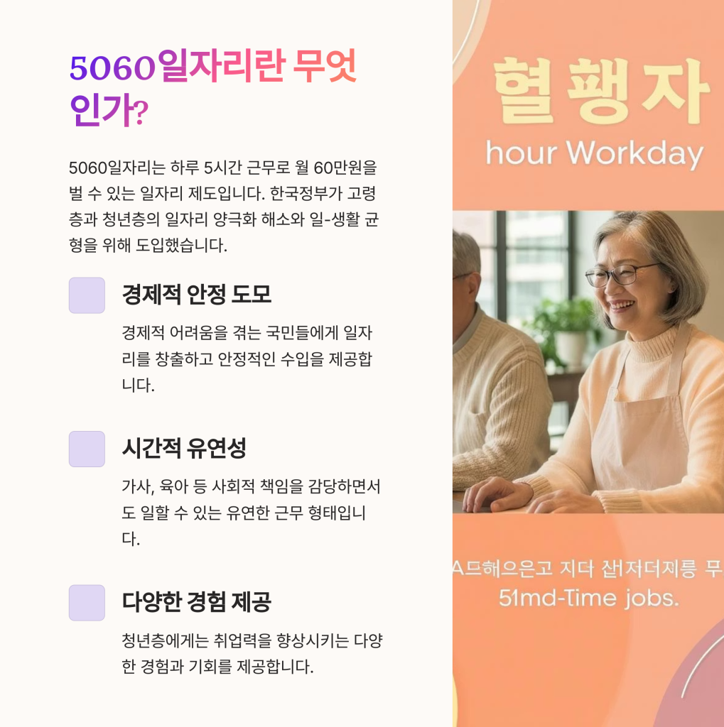 5060일자리는 하루에 5시간씩 일하면서 한 달에 60만 원을 벌어들이는 일자리를 의미합니다. 이는 한국정부가 고령층과 청년층의 일자리 양극화를 해소하고 일과 생활의 균형을 이룰 수 있도록 도와주기 위해 도입한 제도입니다.
