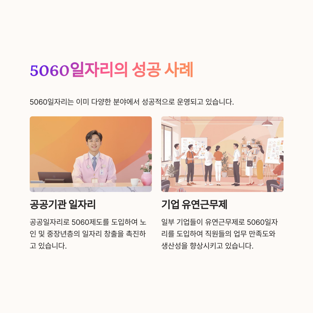 이러한 성공 사례들은 5060일자리가 다양한 분야에서 효과적으로 작용하고 있음을 입증해 주고 있습니다.