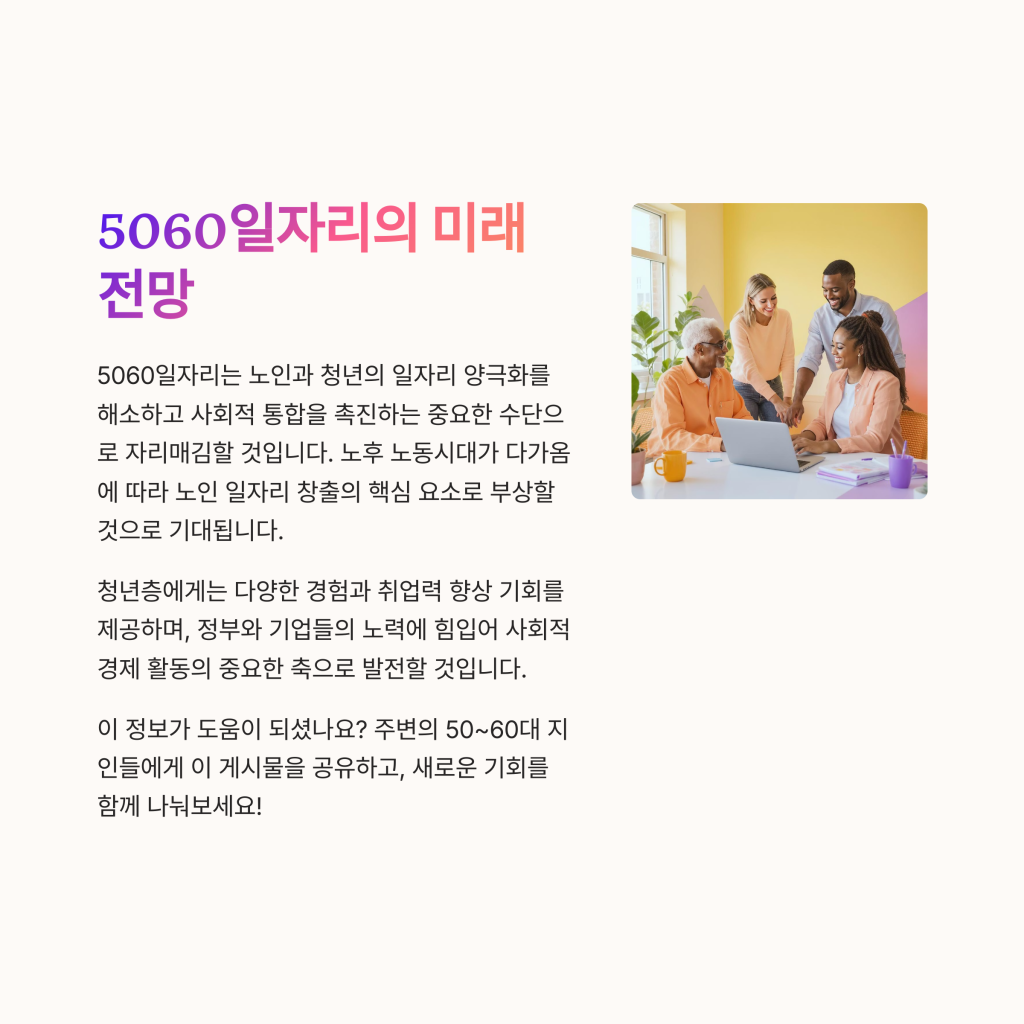정부와 기업들의 노력에 힘입어 5060일자리는 앞으로도 더욱 발전하며 사회적 경제 활동의 중요한 축으로 자리매김할 것으로 기대됩니다.